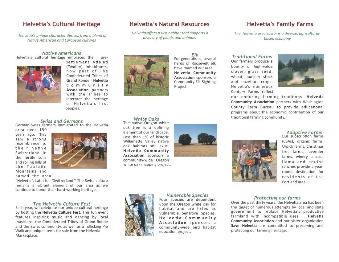 I developed this tri-fold sales brochure at the client's request. Helvetia Community Association